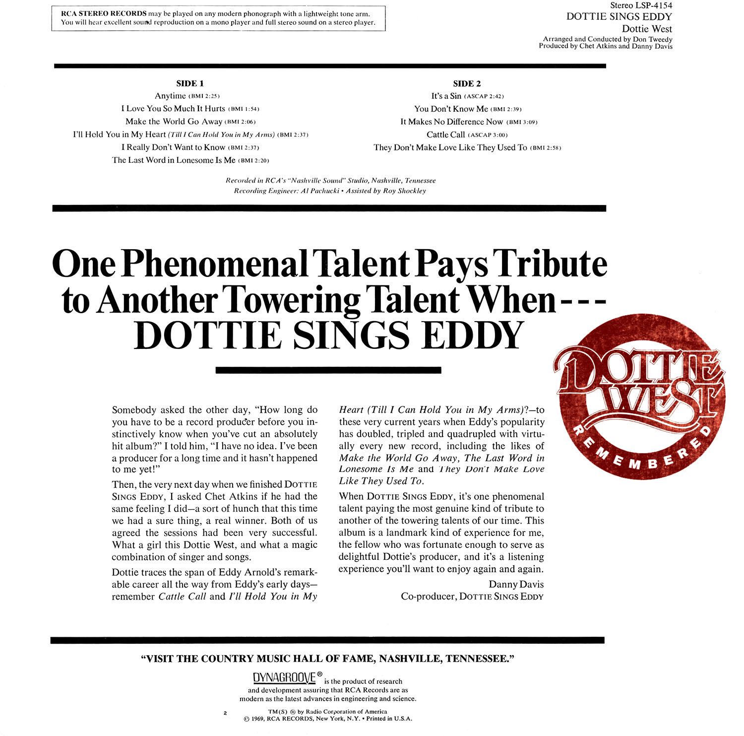 to Another Towering Talent When—DOTTIE SINGS EDDYSomebody asked the other day, “How long do you have to be a record producer before you instinctively know when you’ve cut an absolutely hit album?” I told him. “I have no idea. I’ve been a producer for a long time and it hasn’t happened to me yet!” Then, the very next day when we finished DOTTIE SINGS EDDY, I asked Chet Atkins if he had the same feelings I did—a sort of hunch that this time we had a sure thing, a real winner. Both of us agreed the session had been very successful. What a girl this Dottie West, and what a magic combination of singer and songs. Dottie traces the span of Eddy Arnold’s remarkable career all the way from Eddy’s early days—remember Cattle Call and I’ll Hold You in My Heart (Till I Can Hold You in My Arms)?—to these very current years when Eddy’s popularity has doubled, tripled and quadrupled with virtually every new record, including the likes of Make the World Go Away, The Last Word in Lonesome Is Me and They Don’t Make Love Like They Used To. When DOTTIE SINGS EDDY, it’s one phenomenal talent paying the most genuine kind of tribute to another of the towering talents of our time. This album is a landmark kind of experience for me, the fellow who was fortunate enough to serve as delightful Dottie’s producer, and it’s a listening experience you’ll want to enjoy again and again.