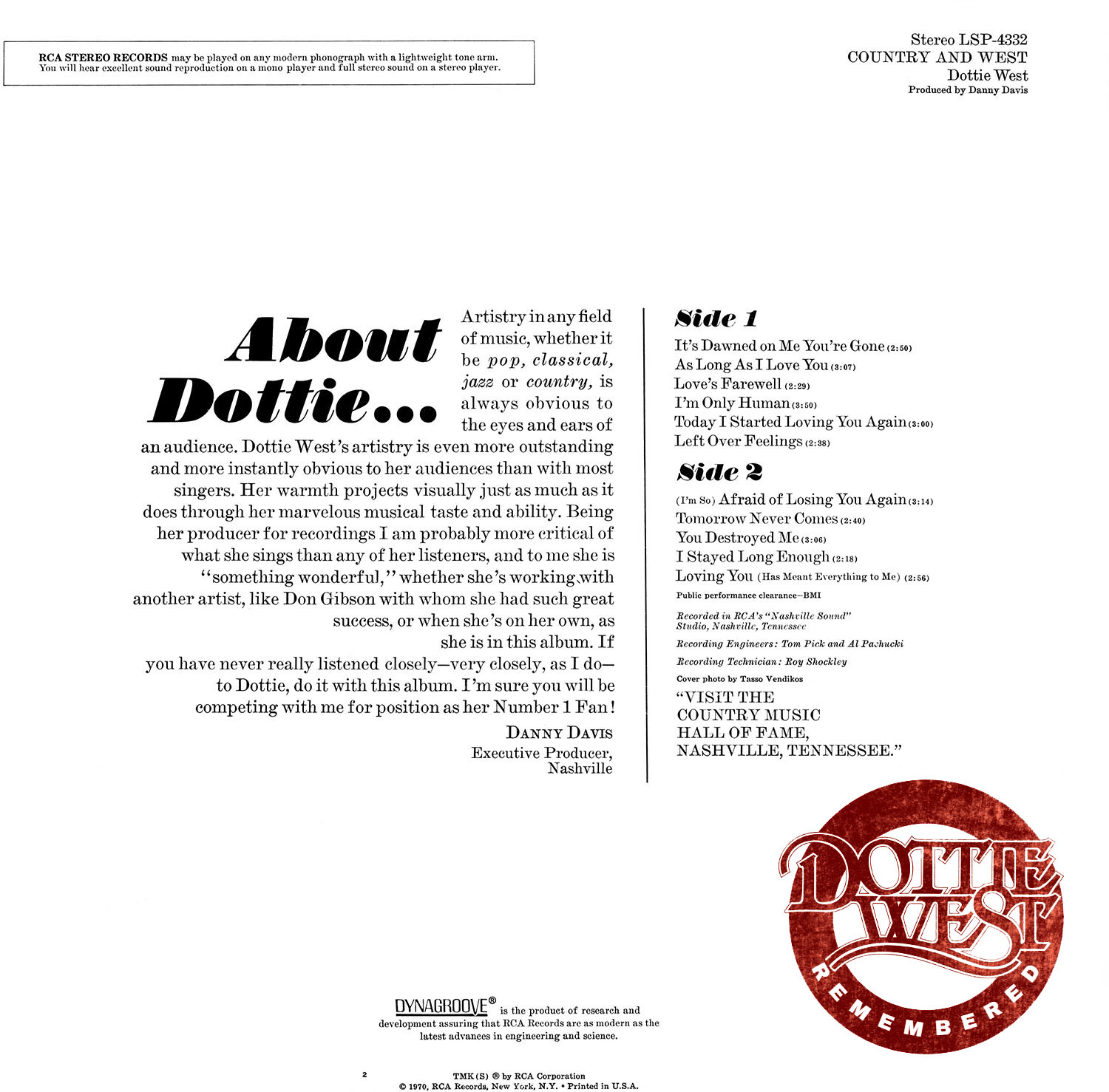 Artistry in any field of music, whether it be pop, classical, jazz or country, is always obvious to the eyes and ears of an audience. Dottie West’s artistry is even more outstanding and more instantly obvious to her audiences than with most singers. Her warmth projects visually just as much as it does through her marvelous musical taste and ability. Being her producer for recordings I am probably more critical of what she sings than any of her listeners, and to me she is “something wonderful,” whether she’s working with another artist, like Don Gibson with whom she had such a great success, or when she’s on her own, as she is in this album. If you have never really listened closely—very closely, as I do—to Dottie, do it with this album. I’m sure you will be competing with me for position as her Number 1 Fan!