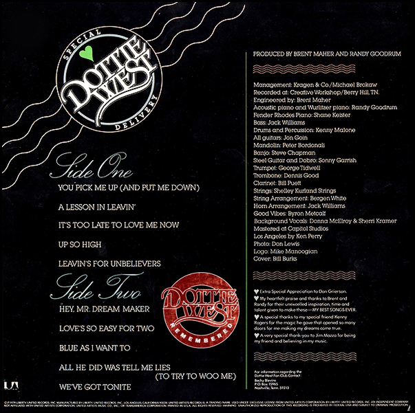 Dottie West’s latest is being marketed; and will be perceived, as a pop record, her breakthrough into the lush greenery of the crossover and indeed the pure pop market. On one hand one might wonder why—Ms. West remains one of country music’s best singers, with an impressive set of hit records behind her, and an impassioned voice that has made quite a few records extremely memorable. On the other hand, there is more than the financial greener grass, and more than her association with Kenny Rogers working on her. This move seems to come at a point in her career where she had done all she could do in country. Though a couple of major awards have eluded her, she has been recipient of most of the awards given to female singers, and has proved she can sing and write with the best—and has proved it for the better part of two decades. Her recent records, often in a more “countrypolitan” vein, did little to advance that standing, and in fact often seemed to squander her talents on second rate songs.